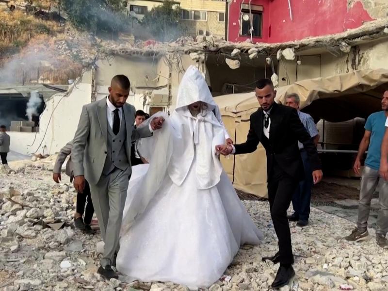 تباہ شدہ گھر کے ملبے سے رخصت ہوتی فلسطینی دلہن