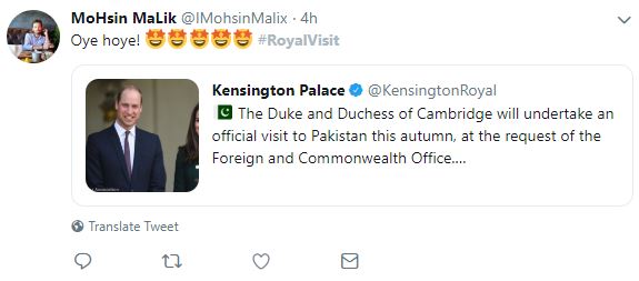 مومنہ سرور نامی ایک صارف نے شہزادہ ولیم اور کیٹ مڈلٹن کی آمد پر خوشی کا اظہار کیا۔