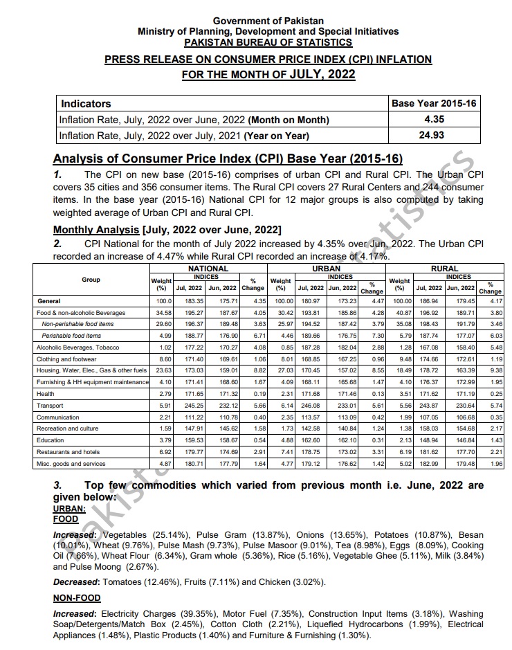 ادارے نے ماہانہ مہنگائی کے اعدادوشمار جاری کیے ہیں جن کے مطابق جولائی میں مہنگائی کی شرح 24.9 فیصد پر پہنچ گئی ہے۔