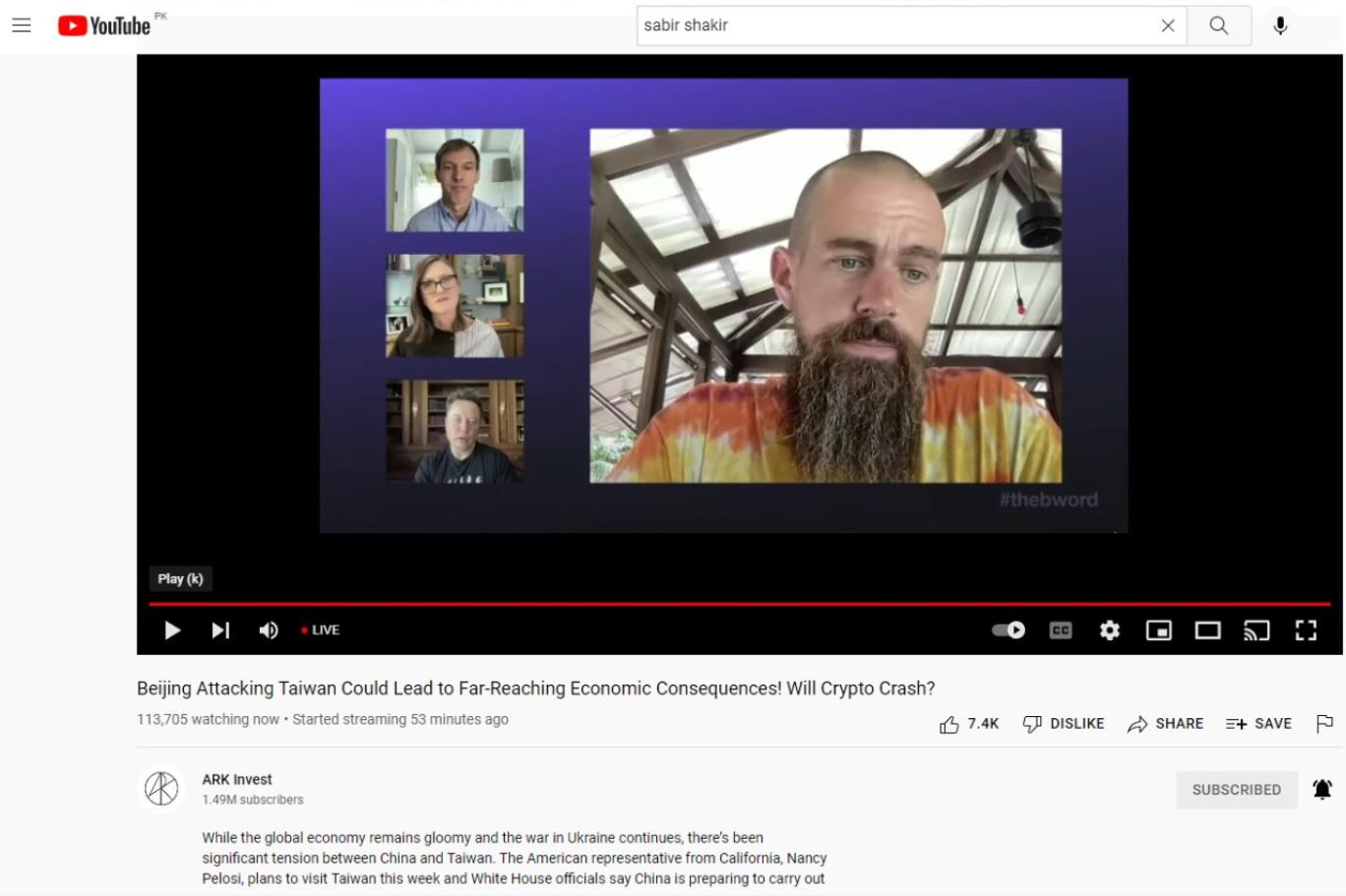 انڈپینڈنٹ اردو نے جب صابر شاکر کے یوٹیوب چینل کا لنک کھولا تو وہاں ایک لائیو سٹریم جاری تھی، جس کا عنوان ’تائیوان پر بیجنگ کے حملے کے نتیجے میں معاشی بحران‘ تھا۔