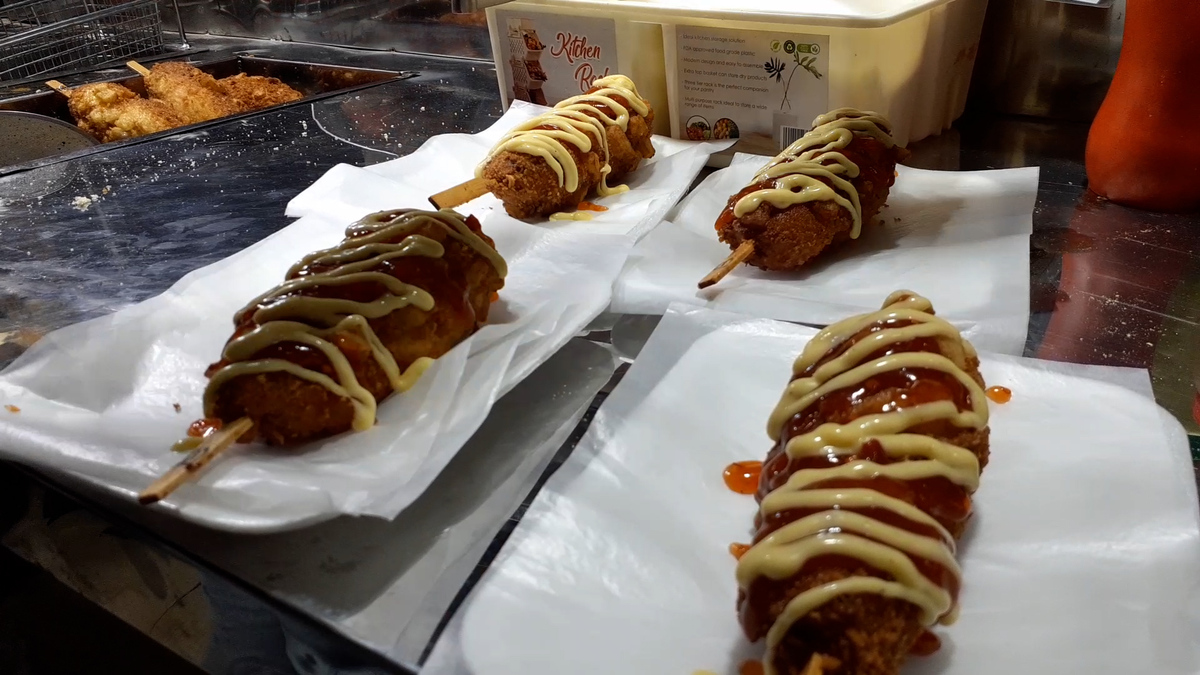 مکئی کے بُھٹوں (چھلیوں) پر چاول، مچھلی کا گوشت، موزاریلا چیز وغیرہ لگا کر پیش کیا جاتا ہے، اور اس آئٹم کو ’کورین کارن ڈاگ‘ کہتے ہیں۔