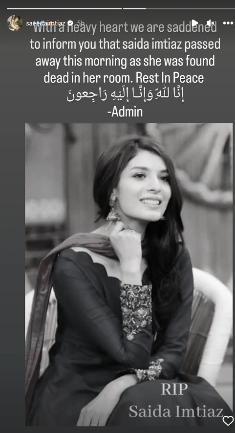 انسٹاگرام پر شیئر کی گئی سٹوری میں بتایا گیا کہ ’سعیدہ امتیاز آج صبح اپنے کمرے میں مردہ حالت میں پائی گئیں۔‘
