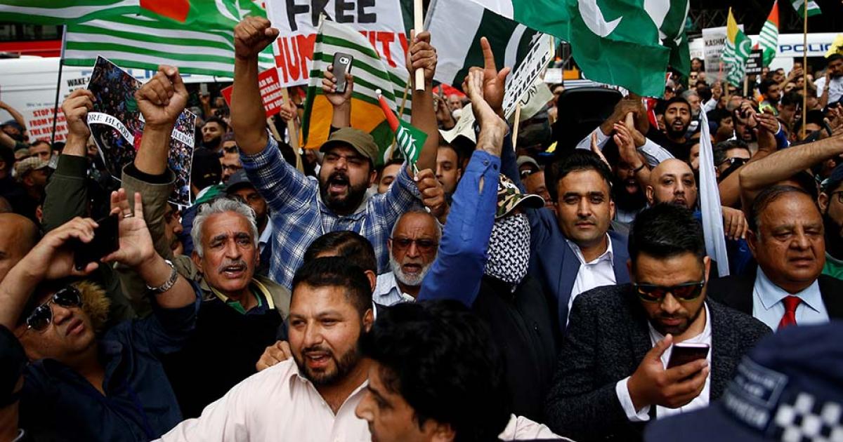 بھارت کی مرکزی حکومت کی جانب سے اپنے زیرِ انتظام کشمیر کی خصوصی آئینی حیثیت ختم کرنے کے خلاف برطانوی دارالحکومت لندن میں واقع انڈین ہائی کمیشن کے باہر ہزاروں افراد نے مظاہرہ کیا۔