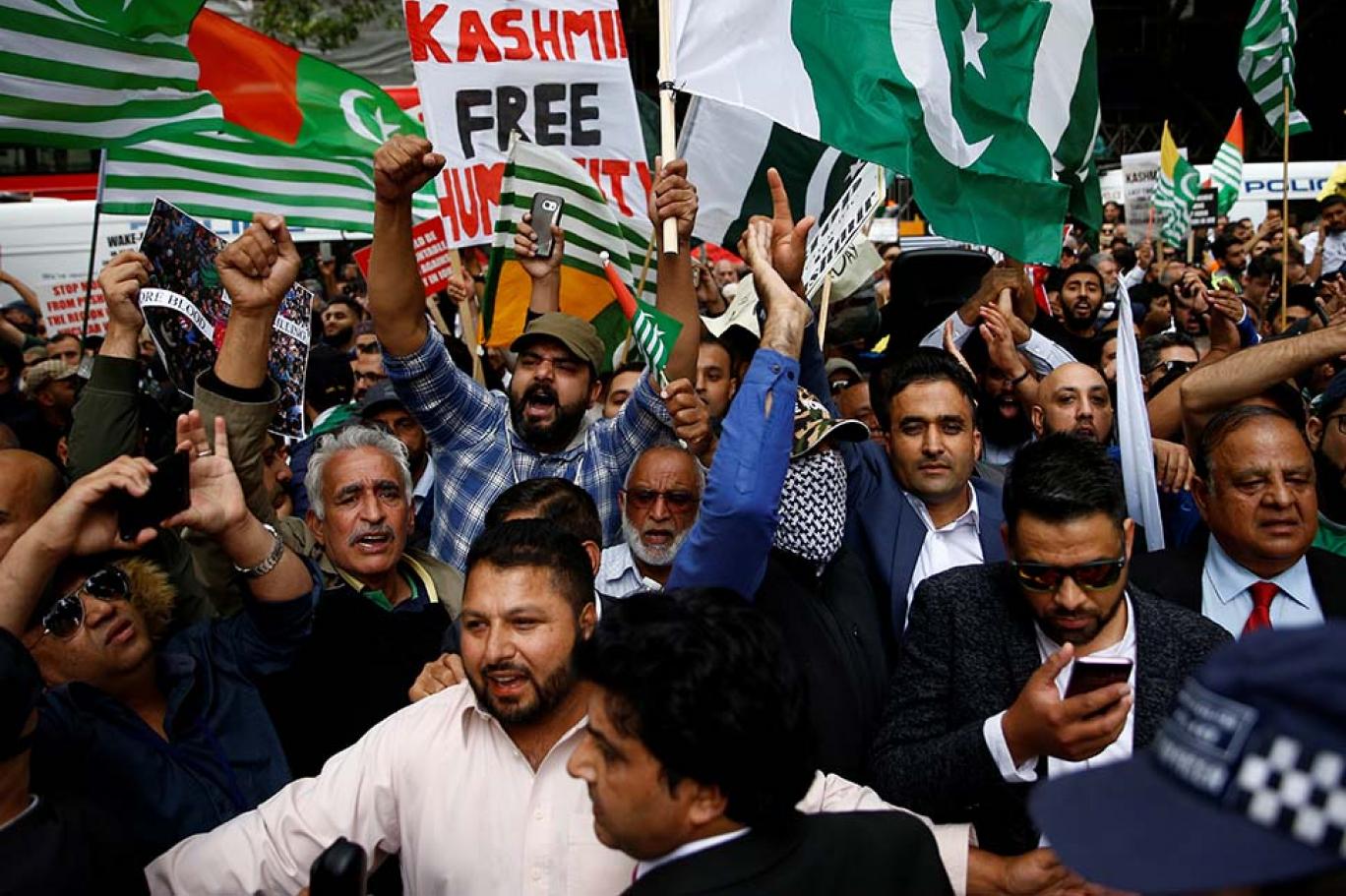 خبر رساں ادارے اے ایف پی کے مطابق مظاہرین نے کشمیر کے حق میں پلے کارڈز اٹھا رکھے تھے جبکہ جابجا پاکستانی اور کشمیری پرچم لہرا رہے تھے۔
