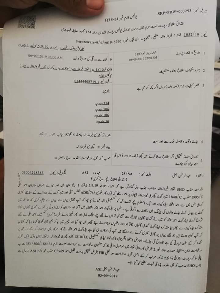 ڈسٹرکٹ پولیس افسر شیخوپورہ غازی صلاح الدین کے مطابق فیروز والہ کچہری میں سیکیورٹی ڈیوٹی پر تعینات لیڈی کانسٹیبل کو تھپڑ مارنے والے وکیل احمد مختار کے خلاف مقدمہ درج کر کے انہیں گرفتارکیا گیا۔ ایف آئی آر میں تین جگہ ان کا نام درست لکھا تھا جب کہ ایک جگہ ان کا نام غلطی سے احمد افتخار لکھا گیا۔ نام اب درست کردیا گیا ہے۔
