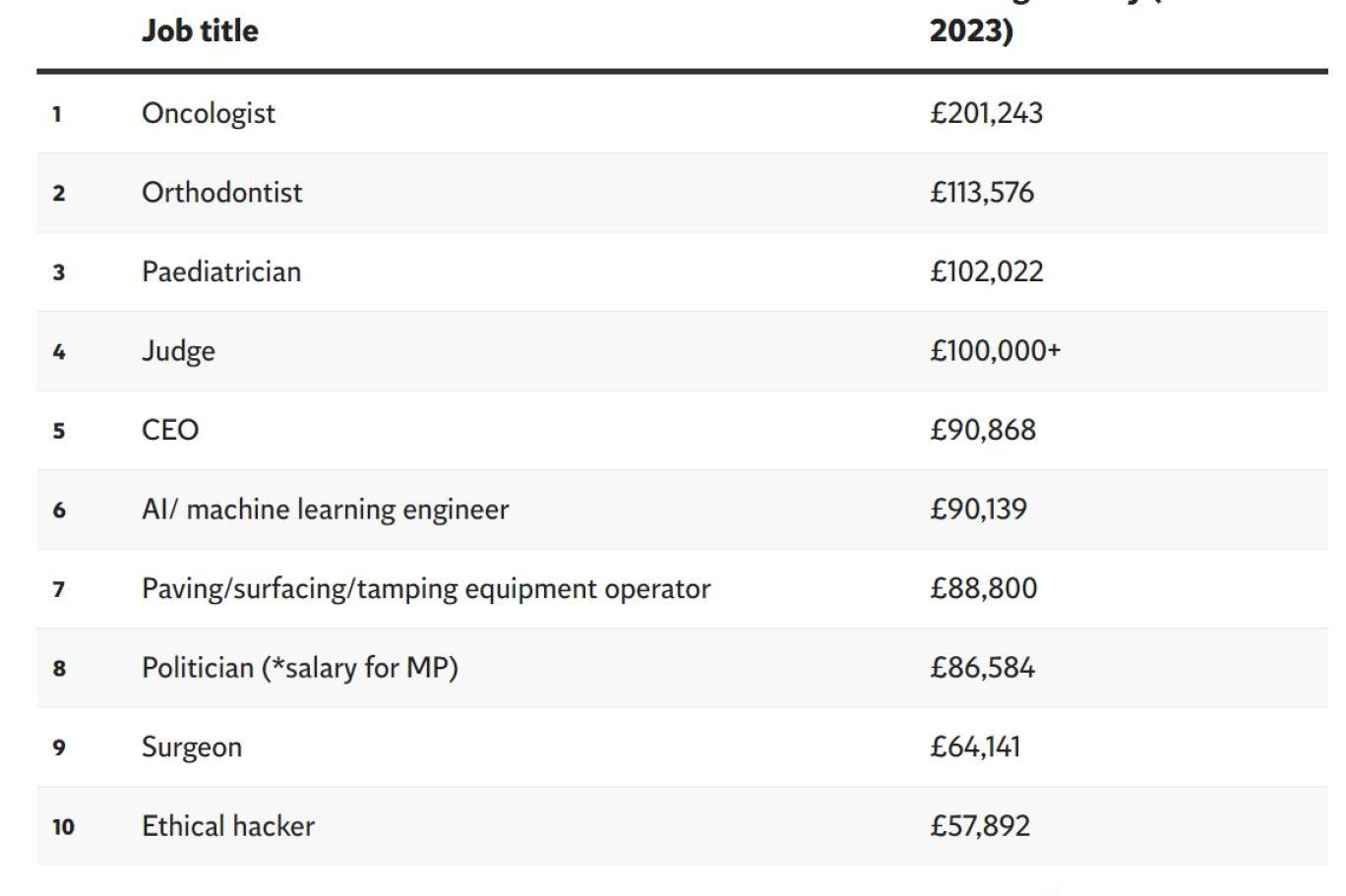 دسمبر میں ایک آنکولوجسٹ کی اوسط اشتہاری تنخواہ دو لاکھ 12 ہزار 43 پاؤنڈ تھی جو اس فہرست میں سب سے زیادہ ہے۔ جبکہ انفلوئنسر، تھراپسٹ اور جج جیسی ملازمتیں بھی مصنوعی ذہانت کی آمد سے محفوظ قرار پائیں۔