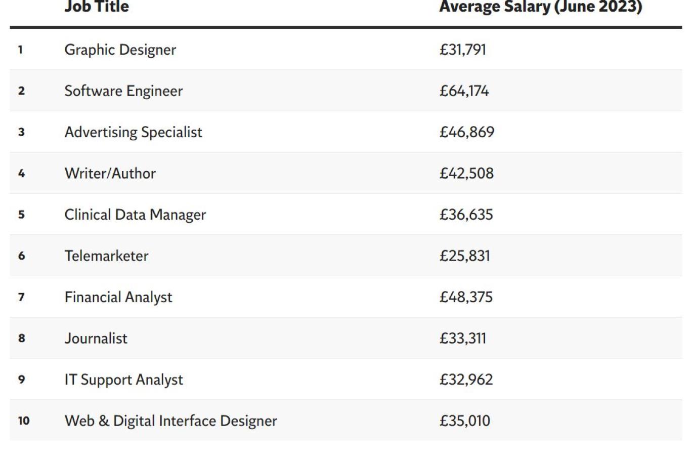 ایڈزونا کے مطابق مصنوعی ذہانت سے سب سے زیادہ خطرہ گرافک ڈیزائنر کو ہے جس کی اوسط تنخواہ 31 ہزار 791 پاؤنڈ ہے۔