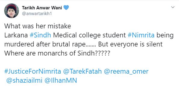 طارق انور وانی نامی اکاؤنٹ سے سوال پوچھا گیا: ’اس کا کیا قصور تھا۔ نمرتا کو بے رحمانہ ریپ کے بعد قتل کر دیا گیا لیکن سبھی خاموش ہیں۔ کہاں ہیں سندھ کے حکمران؟؟؟؟‘