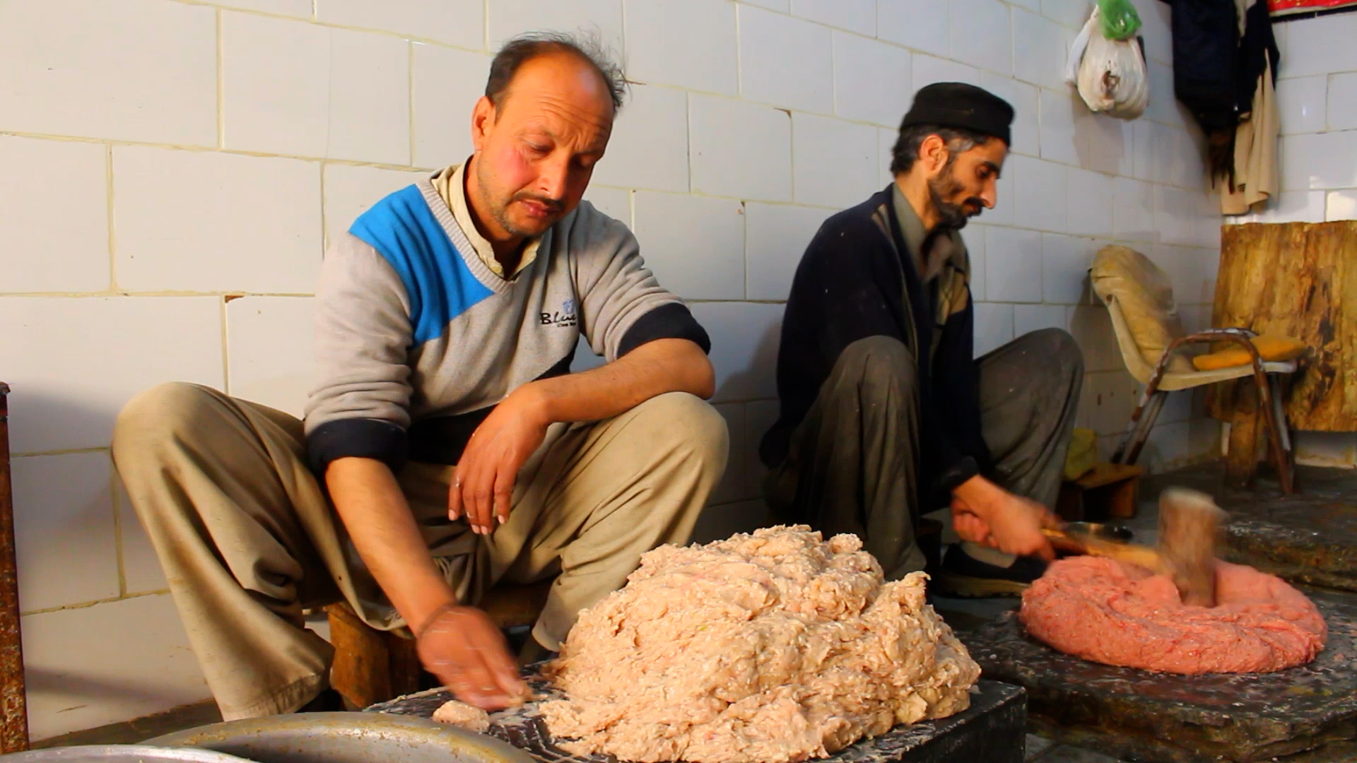 ’پتھر کی سل پر اس ہتھوڑے کی مدد سے گوشت کو کوٹنے کا عمل کئی گھنٹوں اس وقت تک جاری رہتا ہے جب تک گوشت کا ریشہ الگ ہو کر مکمل قیمہ نہ بن جائے۔‘