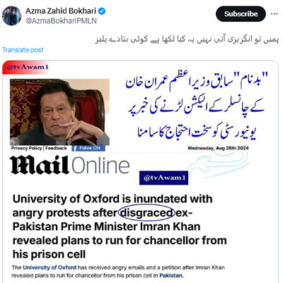وزیر اطلاعات پنجاب عظمی بخاری نے ایکس پر ڈیلی میل کی خبر کا سکرین شارٹ شیئر کرتے ہوئے لکھا ’ہمیں تو انگریزی آتی نہیں یہ کیا لکھا ہے کوئی بتا دے پلیز۔‘