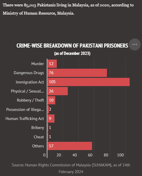 صرف 2024 میں ملائیشیا میں 85 ہزار پاکستانیوں نے 71 ملین ڈالر کی ترسیلاتِ زر بھیجیں۔ 2020 میں 1500 پاکستانی قیدی ملائیشیا سے وطن واپس لائے گئے۔