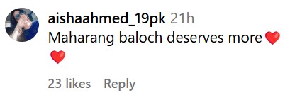 عائشہ احمد نے لکھا کہ ’ماہ رنگ بلوچ مزید کی مستحق ہیں۔‘
