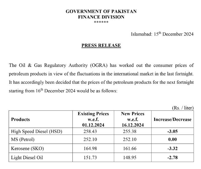 اعلامیے کے مطابق آئندہ 15 دنوں کے لیے پیٹرول کی قیمت 252 روپے 10 پیسے فی لیٹر جبکہ ہائی اسپیڈ ڈیزل کی نئی قیمت 255 روپے 38 پیسے فی لیٹر ہو گی۔