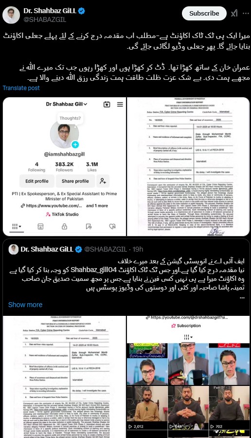 ڈاکٹر شہباز گل نے اپنے ایکس اکاؤنٹ پر ایف آئی آر شئیر کرتے ہوئے لکھا: ’میرا ایک ہی ٹک ٹاک اکاؤنٹ ہے۔ مطلب اب مقدمہ درج کرنے کے لیے پہلے جعلی اکاؤنٹ بنایا جائے گا، پھر جعلی ویڈیو لگائی جائے گی۔