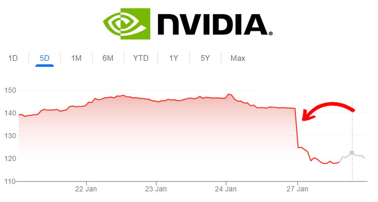 چپ بنانے والی کمپنی اینویڈیا کے سٹاک کی مالیت میں 589 ارب ڈالر کی کمی واقع ہوئی، جب کہ ٹیکنالوجی کمپنیوں کا انڈیکس نیزڈیک تین فیصد گر گیا۔