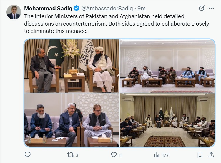 پاکستان کے افغانستان کے نمائندہ خصوصی محمد صادق نے کابل کا دورہ کیا اور طالبان کے سرکاری وزیر خارجہ امیر خان متقی اور وزیر تجارت نورالدین عزیز سے ملاقاتیں ہوئیں۔