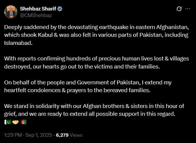پاکستان کے وزیراعظم شہباز شریف نے گذشتہ شب افغانستان میں زلزلے سے سینکڑوں اموات پر اظہار افسوس کرتے ہوئے کہا ہے کہ ’ہم افغان بھائیوں اور بہنوں کے ساتھ کھڑے ہیں اور اس سلسلے میں ہر ممکن تعاون دینے کے لیے تیار ہیں۔‘