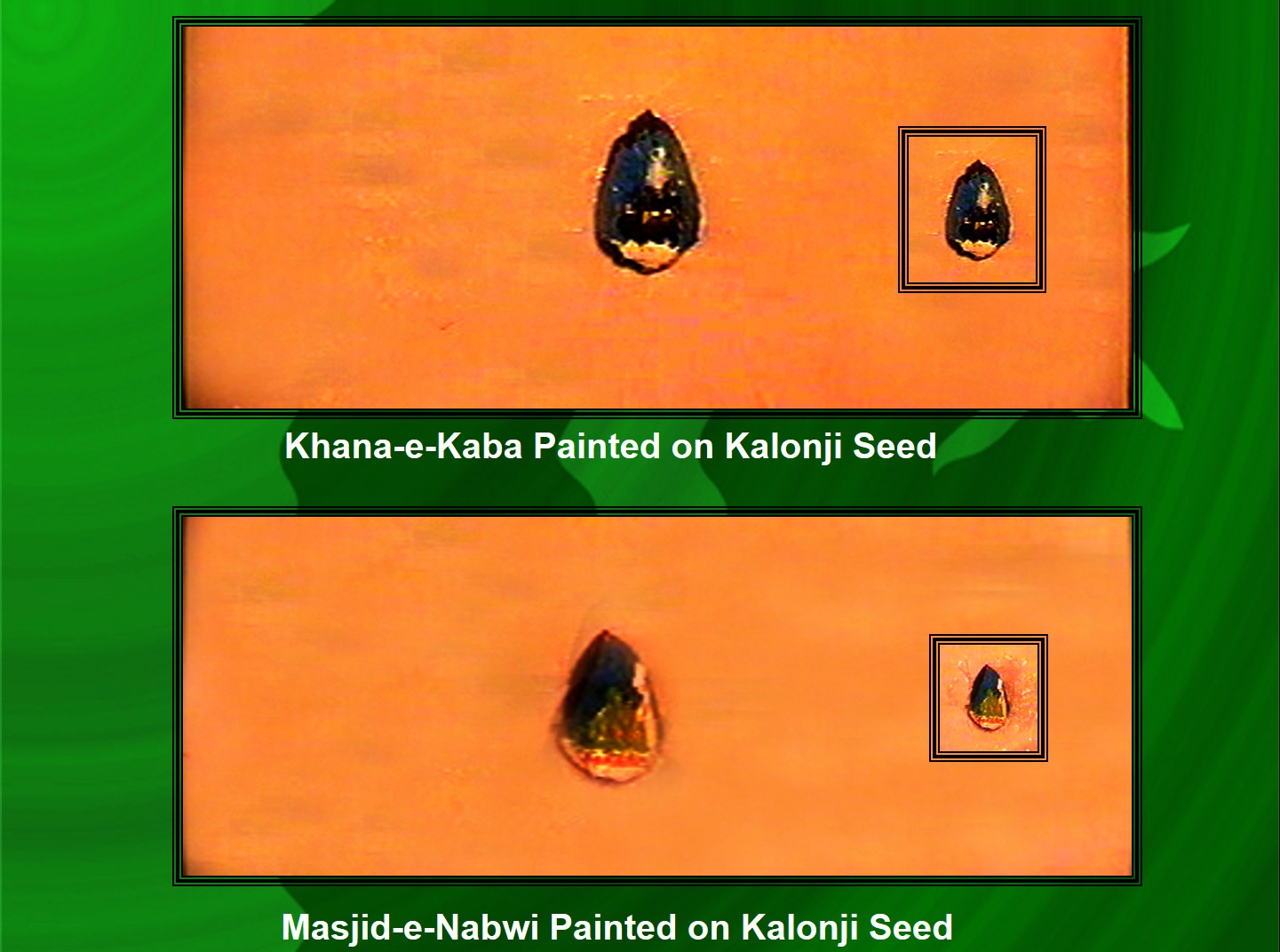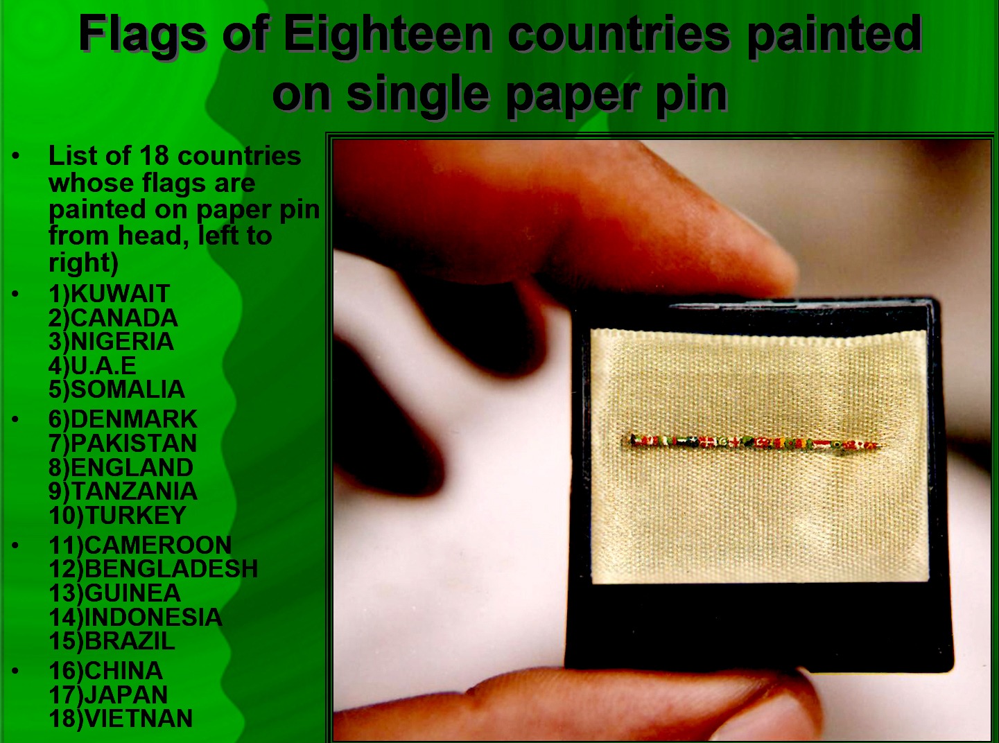 انہوں نے داڑھی کے ایک بال پر ’کلمہ طیبہ‘ لکھا، خشخاش کے ایک دانے پر پاکستان کا سبز ہلالی پرچم بنایا، کلونجی کے دانے پر خانہ کعبہ کی تصویر پینٹ کی اور اس کے علاوہ چاول، دال اور پیپر پن جیسے نہایت چھوٹے میڈیمز پر 18 مختلف ممالک کے پرچم پینٹ کیے۔