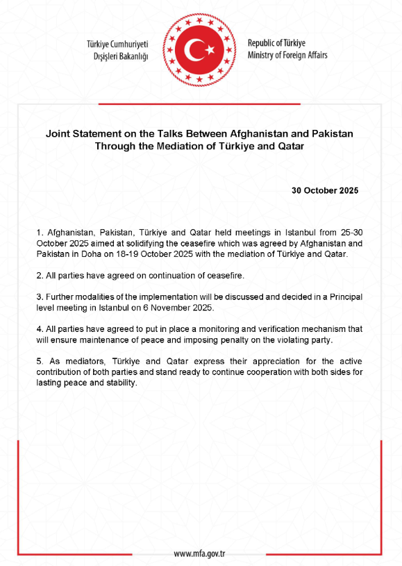 ترک وزارت خارجہ کے مطابق: ’افغانستان، پاکستان، ترکی اور قطر نے 25 تا 30 اکتوبر 2025 کو استنبول میں اجلاس منعقد کیے جن کا مقصد جنگ بندی کے اس معاہدے کو مضبوط بنانا تھا جو 18 تا 19 اکتوبر 2025 کو دوحہ میں ترکی اور قطر کی ثالثی کے ذریعے افغانستان اور پاکستان کے درمیان طے پایا تھا۔‘