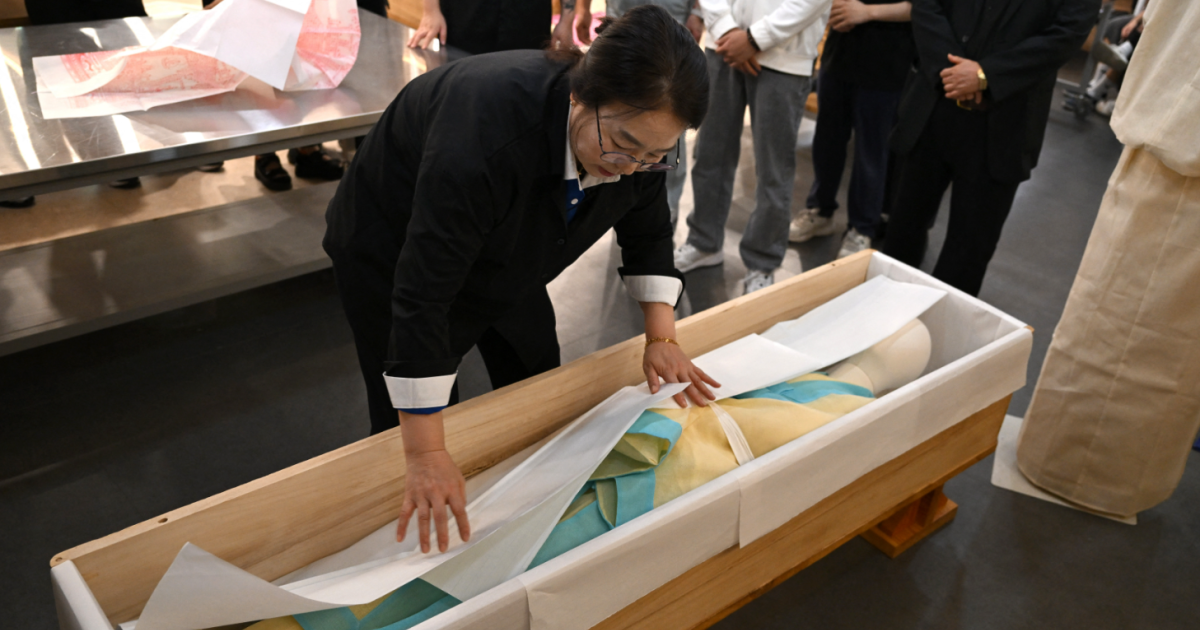 بوسان انسٹی ٹیوٹ آف سائنس اینڈ ٹیکنالوجی کے طلبہ نے ایک انسانی ڈمی کو روایتی کوریائی کفن سے احتیاط سے ڈھانپا، کپڑے کو اس طرح ہموار کیا، جیسے کسی اصل جسم پر کیا جاتا ہے اور پھر آہستگی سے اسے تابوت میں رکھا۔