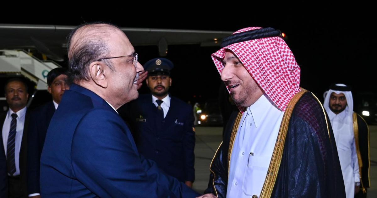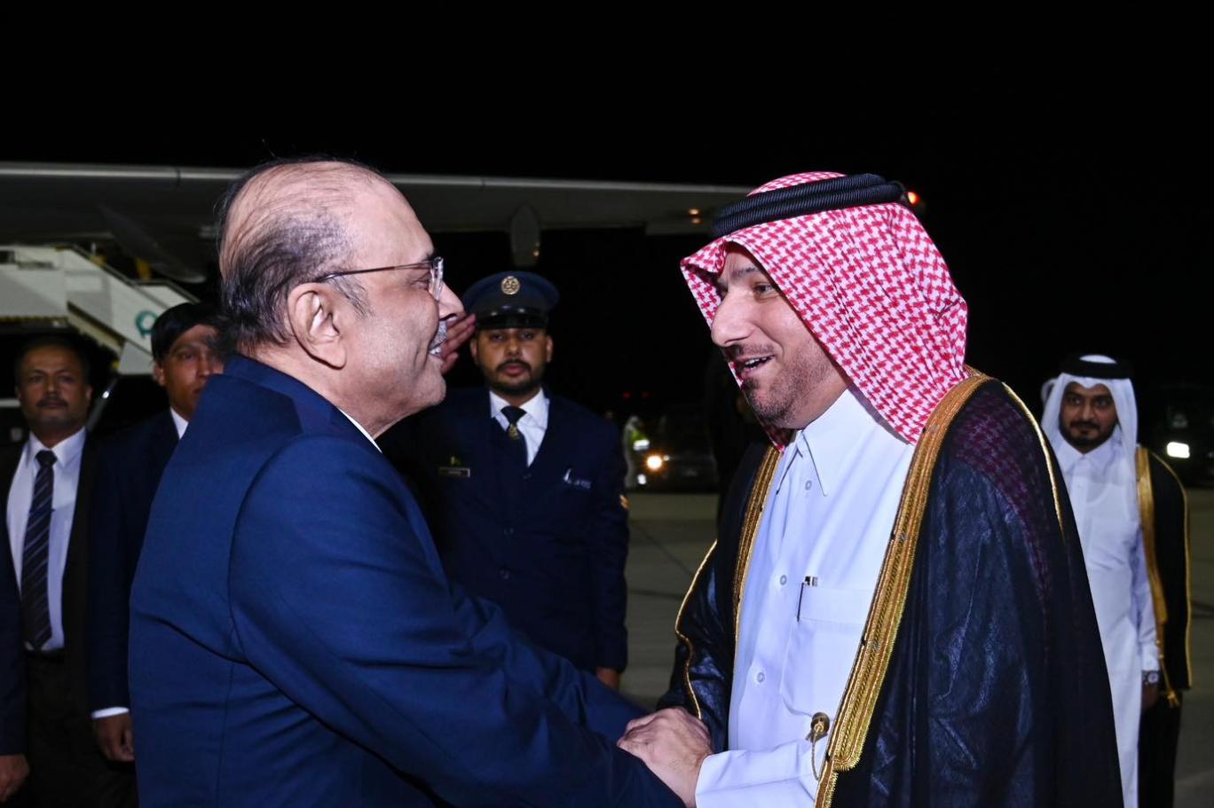 ایسوسی ایٹڈ پریس آف پاکستان نے بتایا کہ دوحہ میں پاکستانی سفیر اور سینیئر قطری حکام نے حمد انٹرنیشنل ایئر پورٹ پر صدر زرداری اور پاکستانی وفد کا استقبال کیا۔