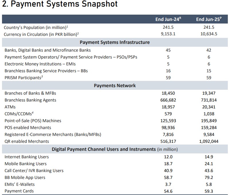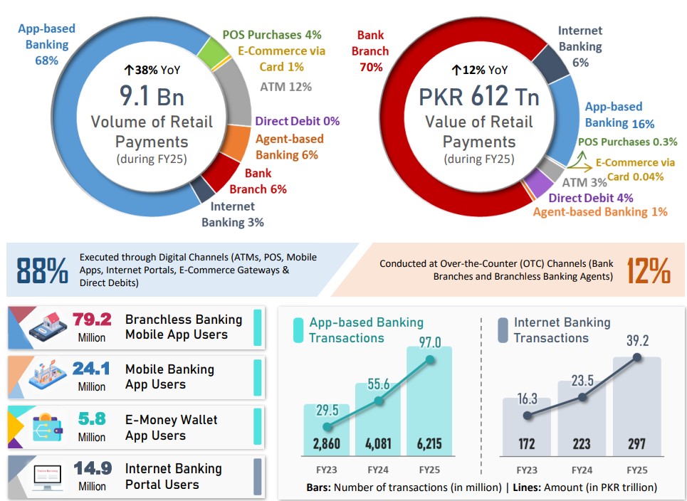 سٹیٹ بینک کے مطابق ڈیجیٹل چینلز نے مسلسل مستحکم پیش رفت دکھائی، کیونکہ پاکستانیوں نے روزمرہ کی ادائیگیوں کے لیے موبائل ایپس، انٹرنیٹ بینکنگ، اور ای منی والٹس کو اپنانا شروع کر دیا۔ ڈیجیٹل چینلز کے ذریعے ہونے والی ادائیگیاں تمام خردہ ٹرانزیکشنز کا 88 فیصد تھیں، جو کہ مالی سال 2023 میں 78 اور مالی سال 2024 میں 85 فیصد سے بڑھ کر ہیں۔