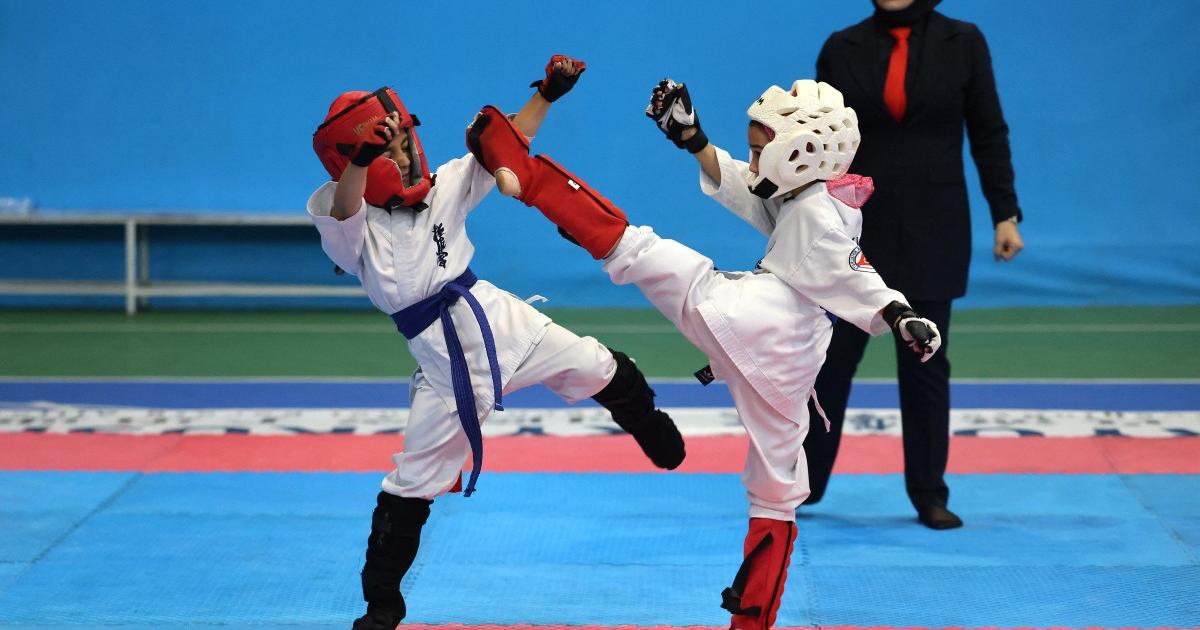 سفید کراٹے یونیفارم میں ملبوس یہ دونوں کمسن حریف رنگین بیلٹس اور حفاظتی ہیڈ گیئر پہنے روایتی اکھاڑے میں ایک دوسرے کے گرد گھوم رہی تھیں۔
