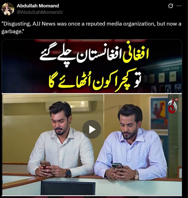 عبداللہ مومند نے ویڈیو شیئر کرتے ہوئے لکھا: ’آج نیوز کبھی کبھی ایک باوقار ادارہ تھا، لیکن اب کچرے میں بدل چکا ہے۔‘