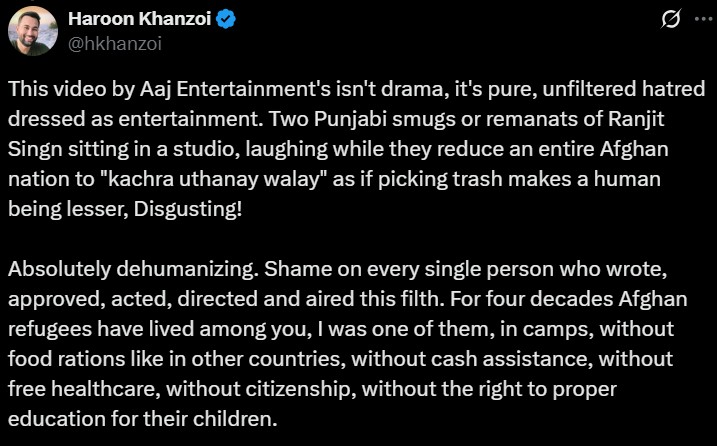 ماہر تجزیہ کار ہارون خانزئی نے تو اسے ’خالص، بغیر فلٹر نفرت‘ کہا، جو ’انٹرٹینمنٹ کے بہانے افغان قوم کو کچرا قرار دے رہی ہے۔‘