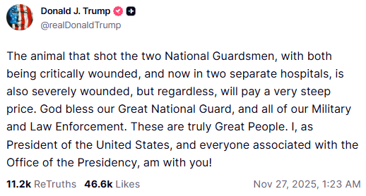 امریکی صدر ڈونلڈ ٹرمپ کی جانب سے رواں سال جنوری میں اپنی دوسری مدت صدارت کے آغاز کے بعد ڈیموکریٹس کے زیرِ انتظام متعدد شہروں کی سڑکوں پر فوجی دستوں کی تعیناتی کے احکامات کے بعد سے فائرنگ کا یہ واقعہ نیشنل گارڈ سے متعلق سب سے سنگین واقعہ ہے