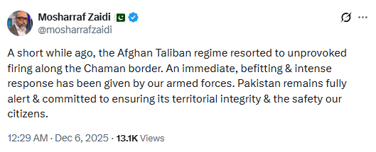 پاکستانی وزیراعظم کے ایک ترجمان مشرف زیدی نے کہا کہ افغان فورسز نے سرحد پر ’بلا اشتعال فائرنگ‘ کی۔