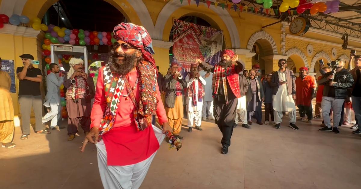 ’سفر ثقافت سندھ‘ کراچی کینٹ سٹیشن سے شروع ہوا جہاں صبح کا منظر معمول سے مختلف تھا، ڈھول کی تھاپ کے ساتھ ثقافتی رقص۔