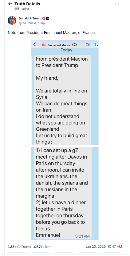 روئٹرز کے مطابق ٹرمپ نے اپنے سوشل میڈیا پلیٹ فارم ٹروتھ سوشل پر میکرون کے ساتھ ہونے والی نجی گفتگو کا سکرین شاٹ شیئر کیا، جس میں فرانسیسی صدر نے لکھا تھا کہ ’مجھے سمجھ نہیں آ رہا کہ آپ گرین لینڈ کے معاملے پر کیا کر رہے ہیں‘ اور روس سمیت دیگر ممالک کو مدعو کرتے ہوئے جی سیون اجلاس کی میزبانی کی پیشکش کی تھی۔ میکرون نے پیغام میں ٹرمپ کو ’دوست‘ کہہ کر مخاطب کیا اور شام اور ایران سے متعلق معاملات پر تعاون کی خواہش بھی ظاہر کی تھی۔