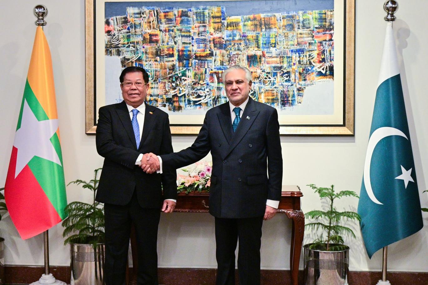 Deputy Prime Minister / Foreign Minister of Pakistan, Senator Muhammad Ishaq Dar @MIshaqDar50, received the Union Minister for Foreign Affairs of the Republic of the Union of Myanmar, H.E. Than Swe, at the Ministry of Foreign Affairs in Islamabad today. pic.twitter.com/d56TPrXBO5