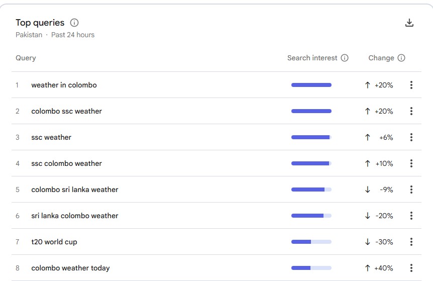 سرچ کیے جانے والے ٹرینڈز میں ویدر ان کولمبو، کولمبو ایس ایس سی ویدر، ایس ایس سی ویدر اور کولمبو سری لنکا ویدر سب سے ٹاپ پر ہیں جن میں گذشتہ رات سے مسلسل اضافہ ہو رہا ہے۔