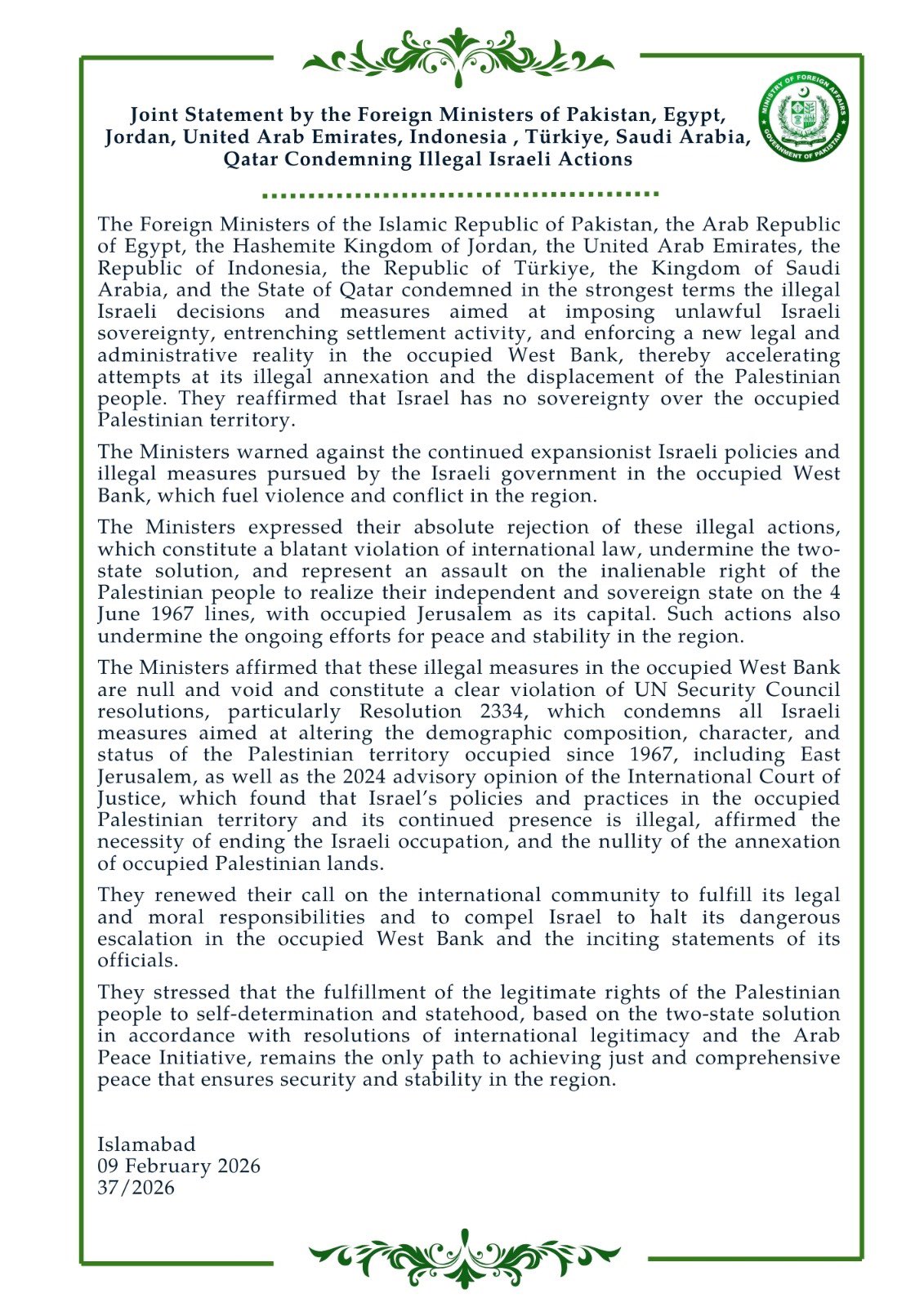 پاکستان، مصر، اردن، متحدہ عرب امارات، انڈونیشیا، ترکی، سعودی عرب اور قطر کے وزرائے خارجہ نے اسرائیل کے ان غیر قانونی فیصلوں اور اقدامات کی شدید ترین الفاظ میں مذمت کی جو ’مقبوضہ مغربی کنارے میں غیر قانونی اسرائیلی خودمختاری مسلط کرنے، بستیوں کے قیام کو مضبوط بنانے اور ایک نئی قانونی و انتظامی حقیقت نافذ کرنے کے لیے کیے جا رہے ہیں، جس سے غیر قانونی الحاق کی کوششیں تیز ہو رہی ہیں اور فلسطینی عوام کی بے دخلی کا خطرہ بڑھ رہا ہے۔‘