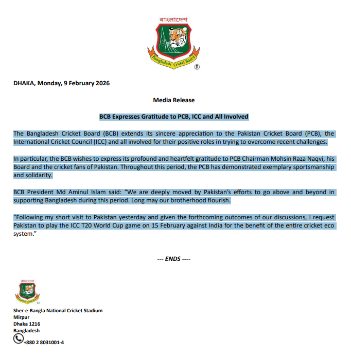 بیان میں مزید کہا گیا کہ حکومت پاکستان نے بی سی بی کے صدر امین الاسلام کے بیان کا بھی نوٹس لیا اور ان کے گہرے تشکرانہ جذبات کو انتہائی گرمجوشی سے سراہا۔