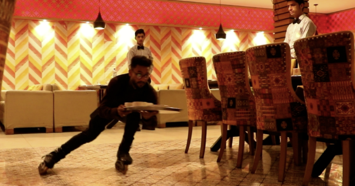 محمد ابرار ایک ویٹر ہیں جو جہلم کے ایک ریسٹورنٹ میں سکیٹنگ شوز پہن کر سکیٹنگ کرتے ہوئے کھانا سرو کرتے ہیں۔