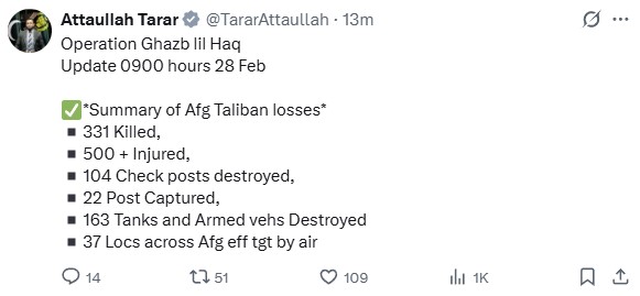 وزیر اطلاعات عطا تارڑ نے ہفتے کی صبح ایک پوسٹ میں افغانستان کے خلاف کارروائیوں کی تفصیلات شیئر کرتے ہوئے کہا ہے کہ ’پاکستانی فوج کے حملوں میں افغان طالبان کے 331 اہلکار جان سے گئے اور 500 سے زائد زخمی ہوئے ہیں۔‘
