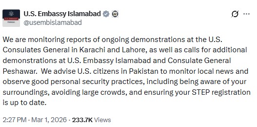 پاکستان میں واقع امریکی سفارت خانے نے ایکس پر لکھا کہ وہ کراچی اور لاہور میں امریکی قونصل خانوں کے باہر جاری مظاہروں کی رپورٹس کی نگرانی کر رہا ہے جبکہ اسلام آباد میں امریکی سفارت خانے اور پشاور میں قونصل جنرل کے دفتر کے باہر مزید احتجاجی مظاہروں کی اپیلوں پر بھی نظر رکھے ہوئے ہے۔