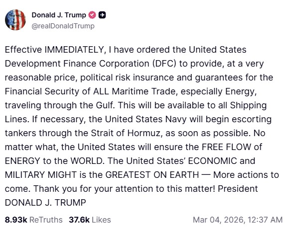 اس صورت حال میں ٹرمپ نے اپنے ٹروتھ سوشل اکاؤنٹ پر لکھا: ’میں نے امریکہ کی ترقیاتی مالیاتی کارپوریشن کو ہدایت دی ہے کہ وہ نہایت مناسب قیمت پر خلیج سے گزرنے والی تمام سمندری تجارت، خصوصاً توانائی کے مالی تحفظ کے لیے سیاسی رسک انشورنس اور ضمانتیں فراہم کرے۔ یہ سہولت تمام جہاز رانی کمپنیوں کے لیے دستیاب ہوگی۔‘