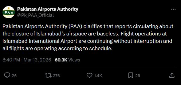 پاکستان ایئرپورٹس اتھارٹی نے بھی سوشل میڈیا پر اسلام آباد کی فضائی حدود کی بندش سے متعلق گردش کرنے والی خبروں کی وضاحت کرتے ہوئے کہا کہ اسلام آباد انٹرنیشنل ایئرپورٹ پر فلائٹ آپریشن معمول کے مطابق جاری ہے۔