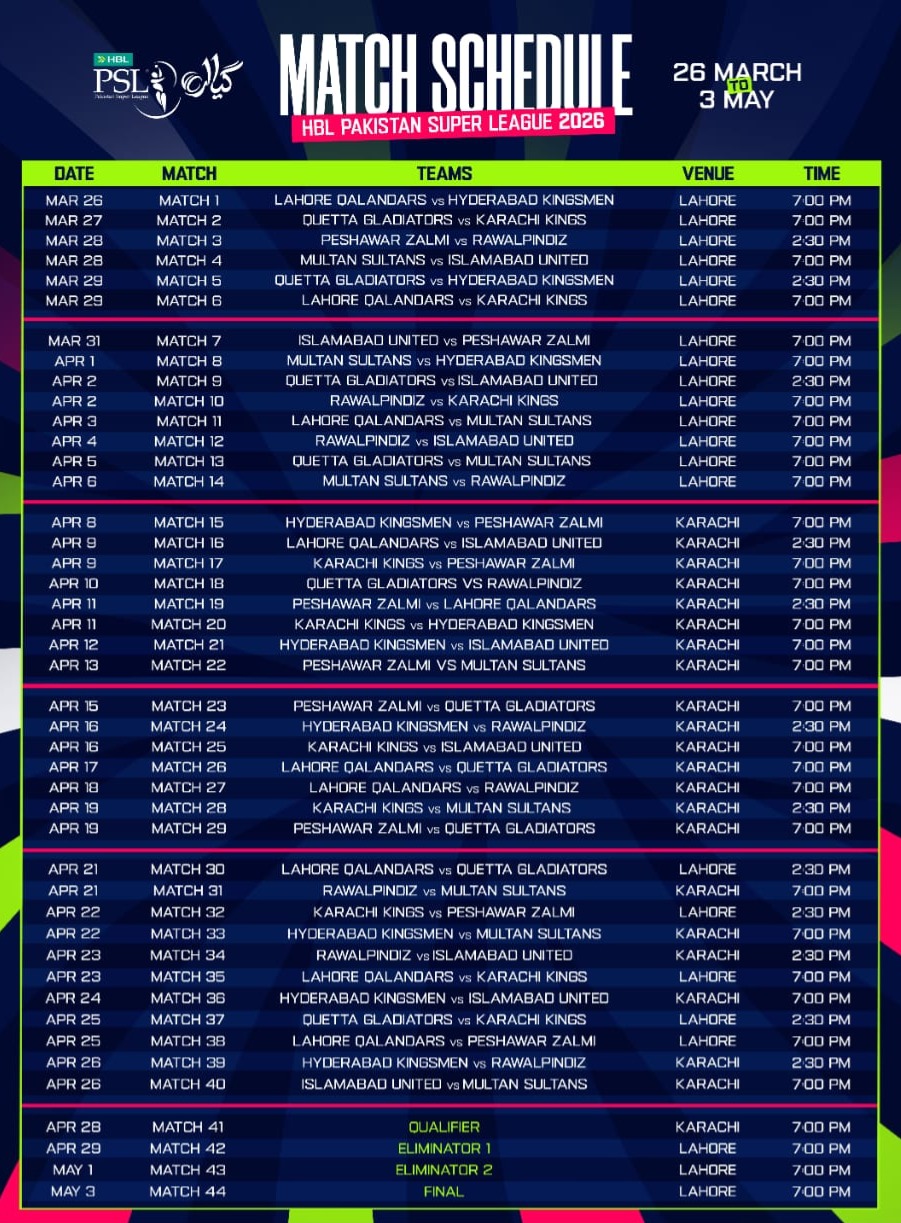 موجودہ عالمی حالات اور ایران امریکہ جنگ کے باعث پی ایس ایل کے تمام 44 میچ لاہور اور کراچی میں کرانے پر اتفاق کیا گیا ہے۔ یہ ایک مشکل فیصلہ تھا اور اس سے لیگ کی ساکھ پر سوال لگ سکتے ہیں لیکن پی سی بی کاموقف ہے کہ موجودہ حالات میں چار مقامات پر ٹیموں کو سنبھالنا مشکل کام ہے۔