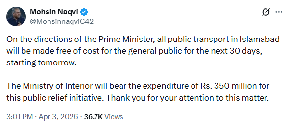 وفاقی وزیر داخلہ محسن نقوی نے اپنے ایکس اکاؤنٹ پر کہا کہ ’وزیراعظم کی ہدایات پر اسلام آباد میں تمام عوامی ٹرانسپورٹ آئندہ 30 دنوں کے لیے عام شہریوں کے لیے مفت کر دی جائے گی، جس کا آغاز کل (چار اپریل) سے ہوگا۔‘