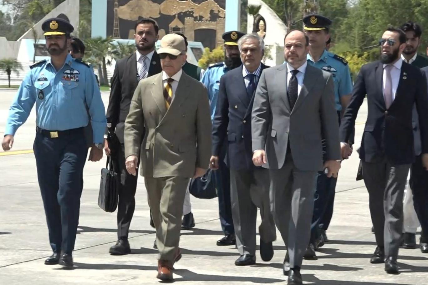 نائب وزیر اعظم و وزیر خارجہ سینیٹر محمد اسحاق ڈار، وزیر اطلاعات عطا تارڑ، وزیر اعظم کے معاون خصوصی طارق فاطمی بھی وزیراعظم کے ہمراہ ہیں۔