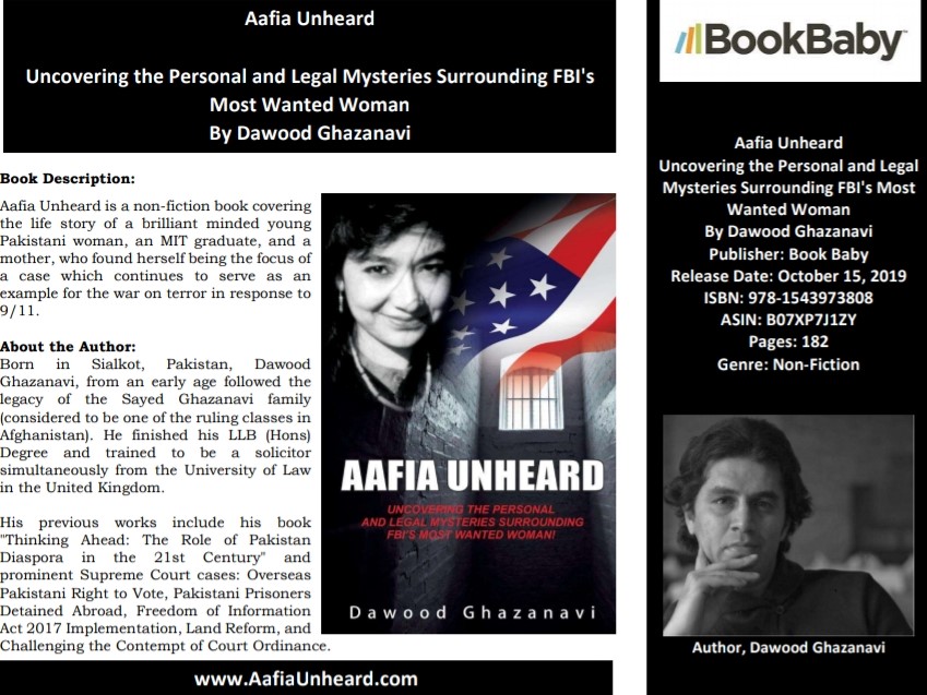 امریکہ میں اسیر ڈاکٹر عافیہ صدیقی پر پاکستانی قانون دان داؤد غزنوی نے ’عافیہ ان ہرڈ‘ کے نام سے ایک کتاب تحریر کی ہے جو امریکہ میں (آج) 24 اکتوبر کو آن لائن جاری کر دی گئی ہے۔ یہ کتاب اپنی اشاعت سے پہلے ہی ایمیزون پر بیسٹ سیلر کتابوں میں شامل ہو چکی ہے جبکہ پیپر بیک پر یہ کتاب نو نومبر کو ہیوسٹن، امریکہ میں جاری کی جائے گی۔