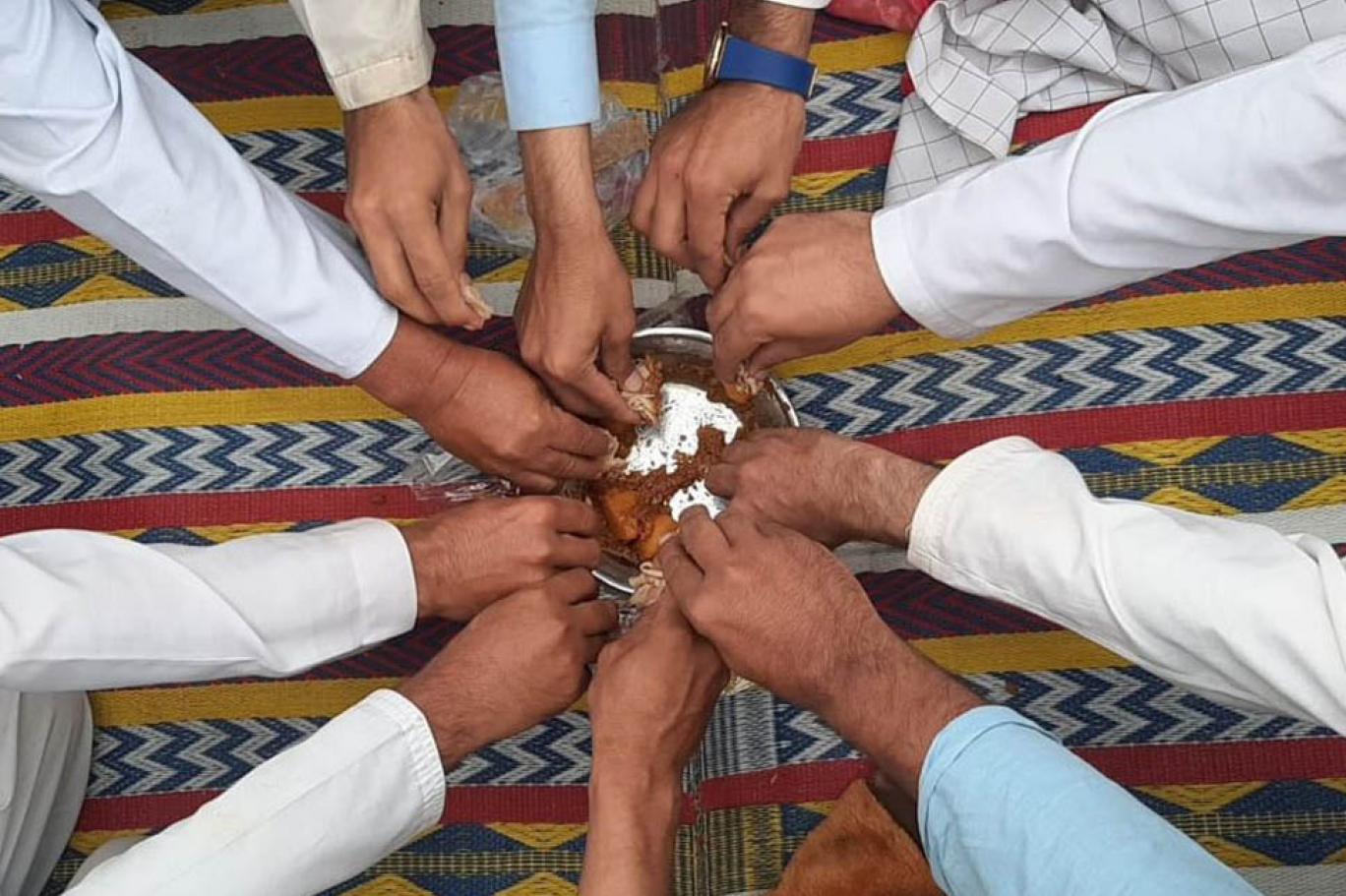 شرکا آلو قیمے کے سالن کا ناشتہ کر رہے ہیں۔(تصویر: سہیل اختر/ انڈپینڈنٹ اردو)