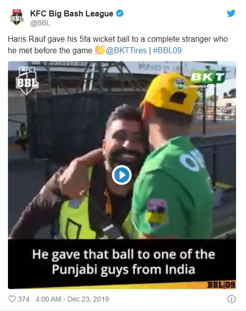 میچ کے بعد بات کرتے ہوئے جب ان سے پوچھا گیا کہ انہوں نے یہ گیند کس کو اورکیوں دی تو حارث رؤف نے بتایا کہ جب وہ میچ کے لیے میدان میں پہنچے تو اس شخص نے ان سے پوچھا کہ وہ کہاں سے ہیں۔
