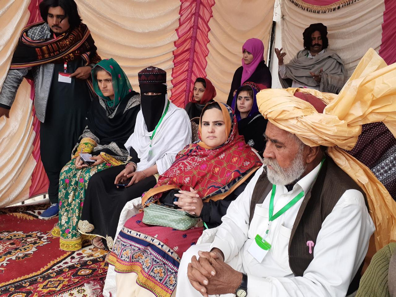 انھوں نے شرکا کو مخاطب کرتے ہوئے کہا کہ ’آپ لوگ مایوس نہیں ہوں گے کیونکہ پی ٹی ایم ہی کی وجہ سےآج پشتونوں کو حکومتی اداروں میں عزت کی نگاہ سے دیکھا جاتا ہے اور پی ٹی ایم ہی کی وجہ سے پشتونوں کا مسئلہ عالمی سطح پر اجاگر ہو رہا ہے نیز پی ٹی ایم ہی کی وجہ سے پشتونوں کے قاتل راؤ انوار پر عالمی پابندیاں عائد کی گئی ہیں۔‘