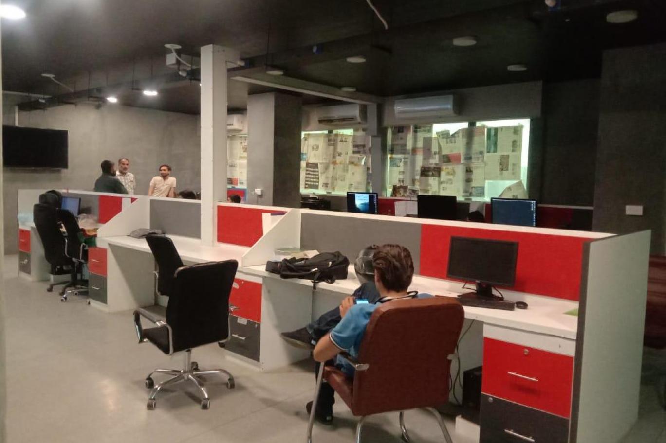 آپ نیوز چینل بند ہونے کی خبر رپورٹ ہونے کے بعد چینل کے کراچی بیورو کا ایک منظر (سوشل میڈیا)